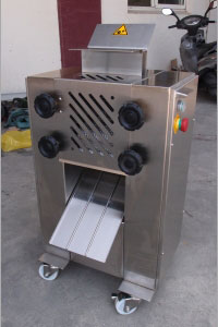 6、確認旋轉(zhuǎn)方向正確后,把帶筋膜的肉,皮朝下放在刀片上,輕踩腳踏板把肉往前推即可。